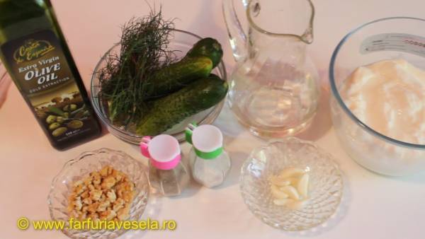 Tocati marunt castravetele, nucile si mararul. Se pun toate acestea intr-un bol si se aduga peste el