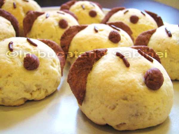 Dam o forma cat mai rotunda fursecului nostru si il punem in tava tapetata cu hartie de copt. Din aluatul maro formam bilute mici care vor fi nasul si bucati ovale plate, mai mari care vor fi urechiusele. Ochii vor fi fulgii de ciocolata.