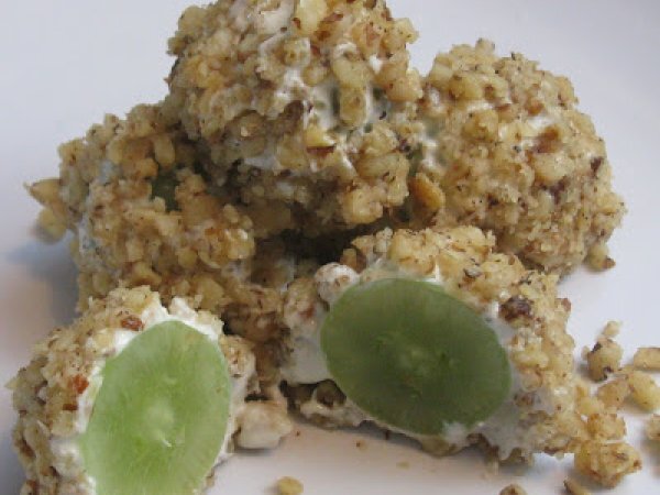 Fiecare boaba se trece prin pasta de branza apoi se tavaleste prin nuca si se pune pe un platou.Sugestie: pentru o prezentare mai formala se poate reforma ciorchinele pe platou, apoi orna cu frunze si carlionti din foietaj.
