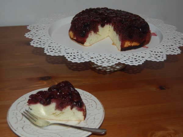 Se presara faina si praful de copt. Se omogenizeaza si se toarna peste visine.